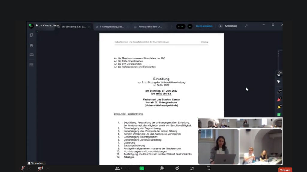 Satzungsänderung, Safe Sex und sichere Partys – die 2. UV-Sitzung im Sommersemester 2022 ist gezeichnet von Schlagabtausch und viel Diskussionsbedarf. Der ÖH-Vorsitzende Daniel Müller (AG) eröffnet pünktlich um 10:00 Uhr die Sitzung der UV, die auch diesmal zusätzlich über Zoom übertragen wird. Nach Abklärung der üblichen Formalitäten, der Genehmigung der Tagesordnung und des Protokolls der letzten Sitzung gibt Müller einen kurzen Überblick über die letzten Wochen: Ein Treffen mit der IVB stellte sich als fruchtbar heraus. Ab 1. September wird es für alle Studierenden der Uni Innsbruck möglich sein, die IVB-Stadträder für eine halbe Stunde einer jeden Fahrt kostenlos zu nutzen. Kostenpunkt für die ÖH: knapp 23.000 Euro.