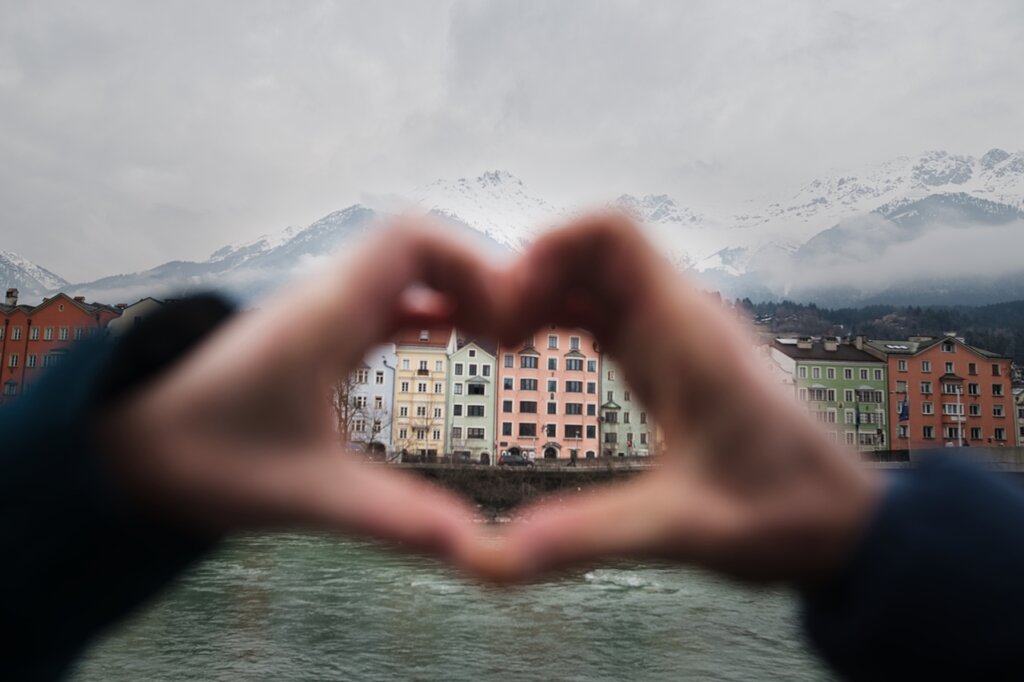 Alte Liebe rostet nicht – eiserne Pärchenschlösser dagegen schon. Schikaniert vom Innsbrucker Wind und Wetter und mit braunroten Schlieren bedeckt, reiht sich eines an das nächste auf der namensgebenden Innbrücke. Anderthalb Kilometer und zwei Jahreszeiten später finden sich bewegungswillige Yoga-Aficionados im Rapoldipark. Eine fremde Hand hält die andere an der Uniklinik. Es sind zunächst willkürliche Augenblicke und Momente, und doch zeichnen sie sich alle durch ein Merkmal aus: sie sind romantische Liebe, Selbstliebe, Liebe zum Nächsten. Das Bordell an der Südbahnstraße, die Wiltener Basilika, unsere Skisprungschanze. Freie Liebe. Gottesliebe. Liebe zum Sport.