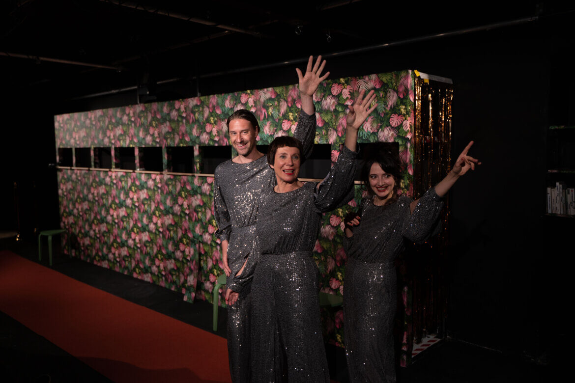 Ich war schon öfter im Theater, doch dieses scheint mir besonders zu sein. Die einstigen Büroräumlichkeiten wurden von der Theatergruppe selbst umgebaut, nun steht in dem kleinen dunklen Raum eine Bühne samt Bühnenbild. Auf das Wesentliche beschränkt und doch mit einem besonderen Flair. Das Publikum sitzt quasi mit auf der Bühne. Nur zwei Stuhlreihen stehen entlang der Bühne und an einer Seite. Die hautnah vor einem stehenden Schauspieler:innen ziehen einen in ihren Bann. Es geht halt doch nichts darüber, live dabei zu sein.