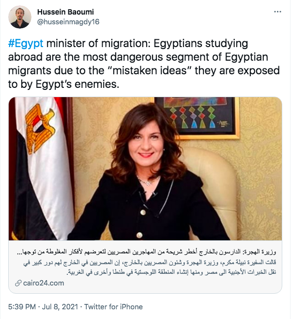 Sind Ägypter*innen, die ein Auslandsstudium absolvieren, also Migrant*innen? Wird somit suggeriert, dass sie das ultimativ Fremde darstellen – oder sogar das „Böse“? Gilt das, was diese Studierenden im Ausland lernen, automatisch als anti-ägyptisch, als falsch oder verwerflich?